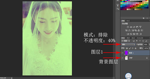 运用素材4-2(背景图层),上层加上一层紫色(R:150、G:0、B:255)(图层1),将图层1图层混合模式改为“排除”,改变图层不透明度为40%,效果如图所示: