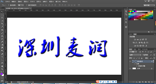 本次素材为文字图片,首先建一个1000*500的白色画布,运用文字工具写上“深圳麦润”,文字颜色选择蓝色,字体选择任意一种即可。具体效果如下:
