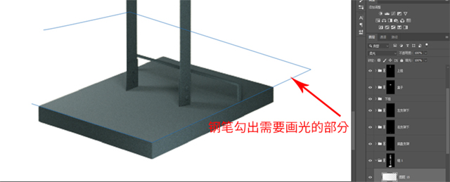 分完结构根据对不同结构进行铺光即可。渲染图有一些结构在产品实拍中可以分了但是在渲染图中没有分,主要是为了方便,对于没有分结构的部分在进行铺光时可以采用路径描边画光【路径描边画光在前几期也分享过:路径描边画光教程】以及使用比较简便的临时选区画光。