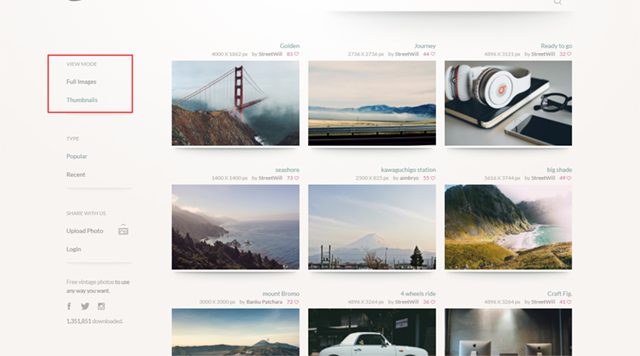 而且可以对图片的查看模式进行选择,打开网站默认是完整图片,也可以选择缩略图,网站对最受欢迎的照片以及最新照片都做了专栏,可以直接在左侧找到,更方便你的素材寻找。