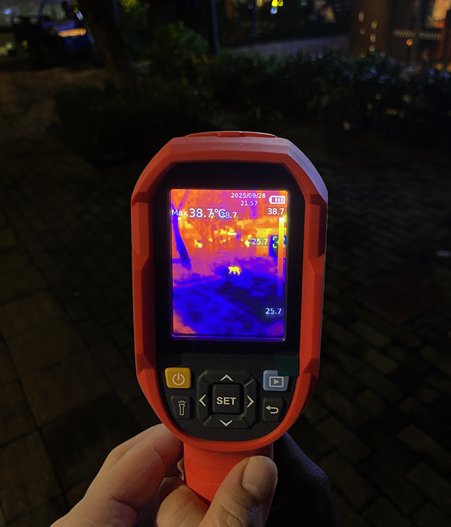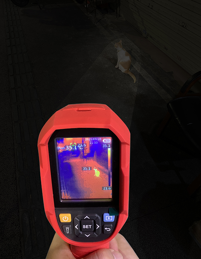 宠物走失后会变得胆小(尤其是猫咪,白天一般不敢出来),晚上会出来觅食,越黑越好找宠物与环境温差大,热成像黑夜成像清晰。