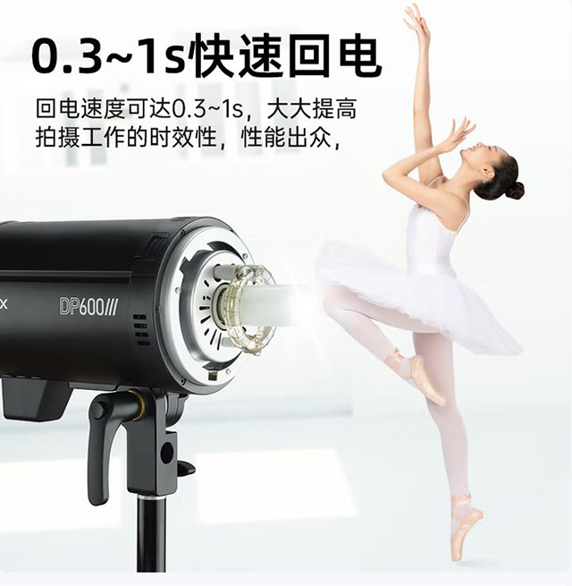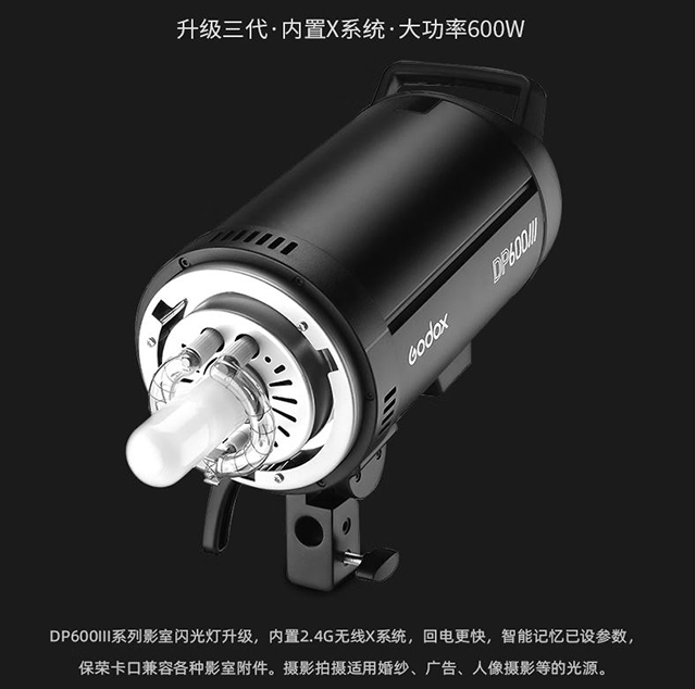 DP600II系列影室闪光灯升级,内置2.4G无线X系统,搭配X1、XPro发射器,可远程调节闪光灯。