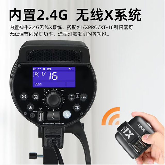 内置神牛2.4G无线X系统,可以配合X1、XT16功率遥控使用